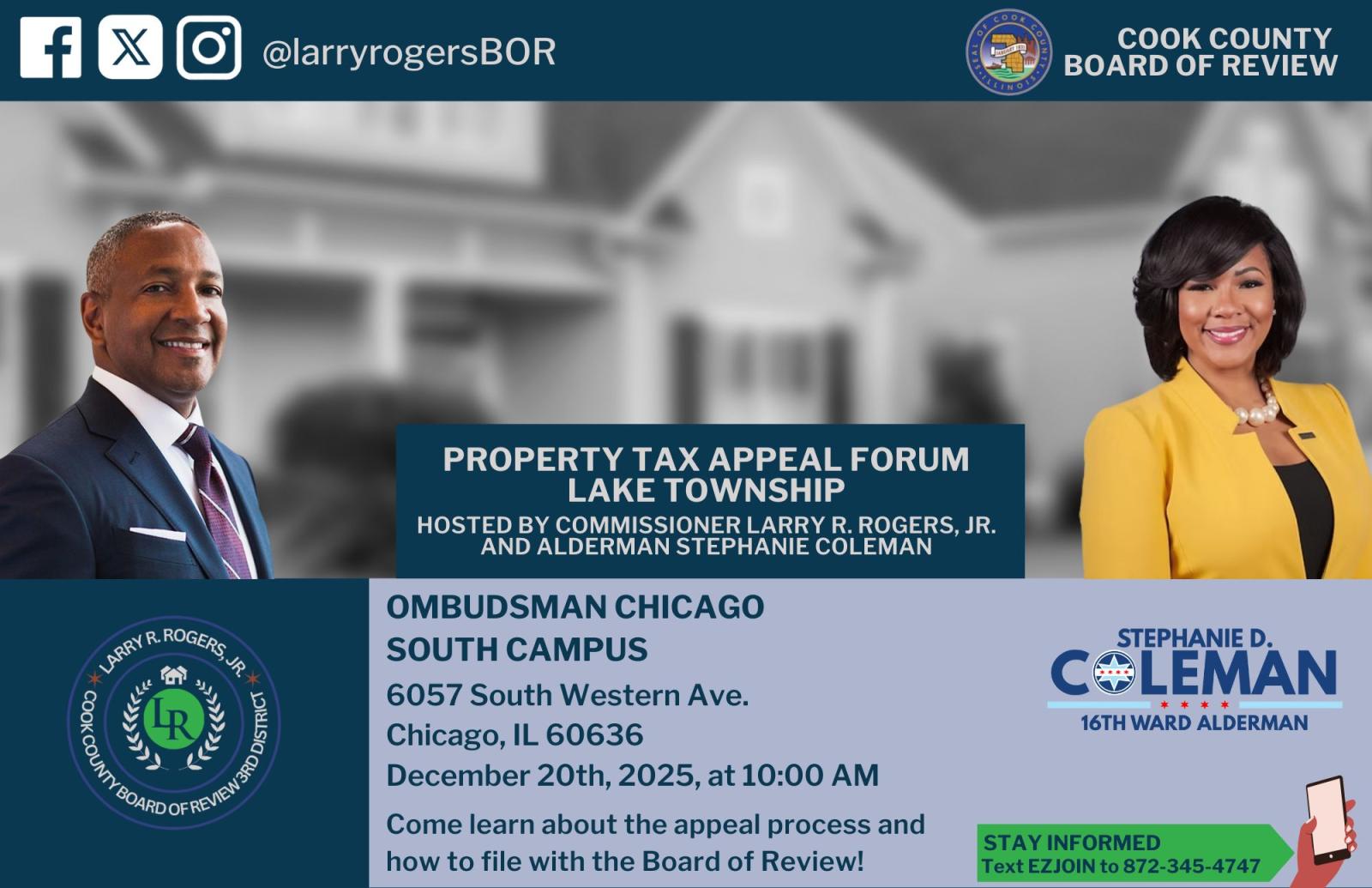 If you have any questions or concerns, please contact my office by email BORdistrict3info@cookcountyil.gov or by phone at 312-603-5540. It is an honor and privilege to continue serving you.