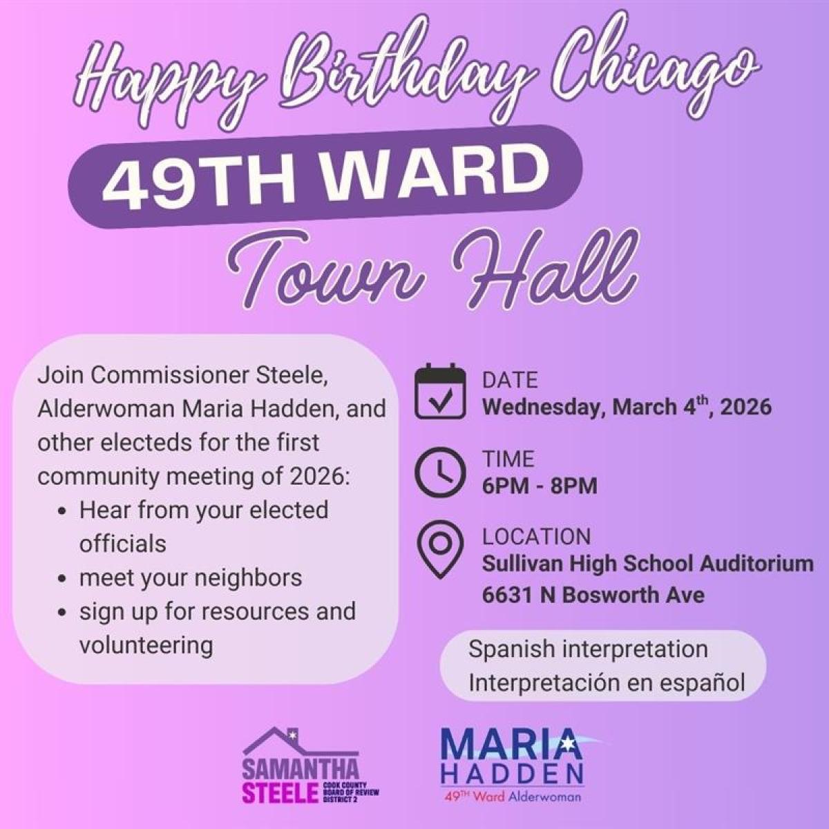 You’re invited to join us at the 49th Ward Town Hall. Hear directly from Commissioner Samantha Steele and other electeds for the first community meeting of 2026. Connect with our onsite team for assistance, ask questions, and access resources.