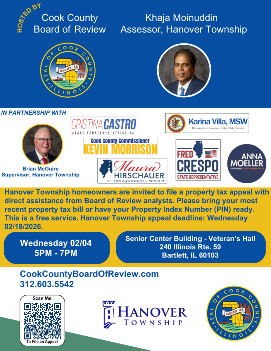 Hanover Township homeowners are invited to file a property tax appeal with direct assistance from Board of Review analysts. If you win the appeal, the Board of Review will look to lower the Assessed Value used to calculate your property taxes. Please bring your most recent property tax bill or have your Property Index Number (PIN) ready. This is a free service. The deadline for Hanover Township homeowners to submit an appeal to the Board of Review is Wednesday 02/18/2026