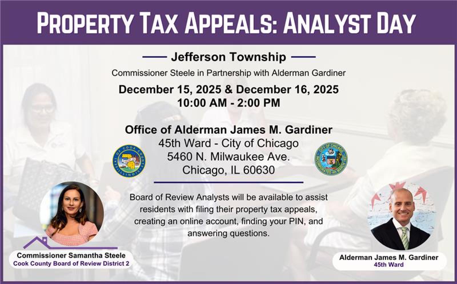 Board of Review Analysts will be available to assist residents with filing their property tax appeals, creating an online account, finding your PIN and answering questions.