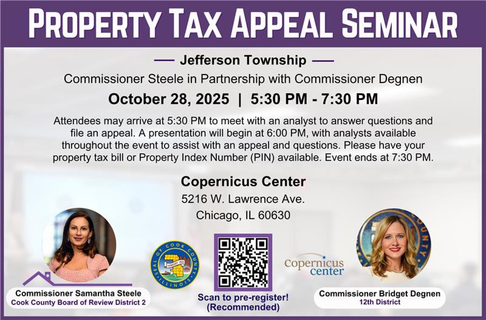 Please join Board of Review Commissioner Samantha Steele in partnership with elected officials of Jefferson Township for an informational seminar on how to appeal your property taxes on October 28, 2025, at 5:30 PM.