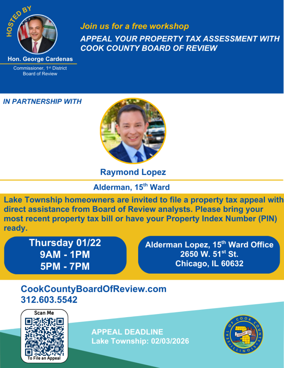 Propietarios del municipio Lake Township son invitados a llenar una apelación de impuestos de propiedad. Recibirá asistencia directa de la Junta de Revisión del Condado Cook. Por favor tenga su factura de impuestos de propiedad mas reciente o número de índice de propiedad (PIN#) listo. Ganar una apelación puede resultar en futuros impuestos de propiedad reducidos. Este servicio es gratis.