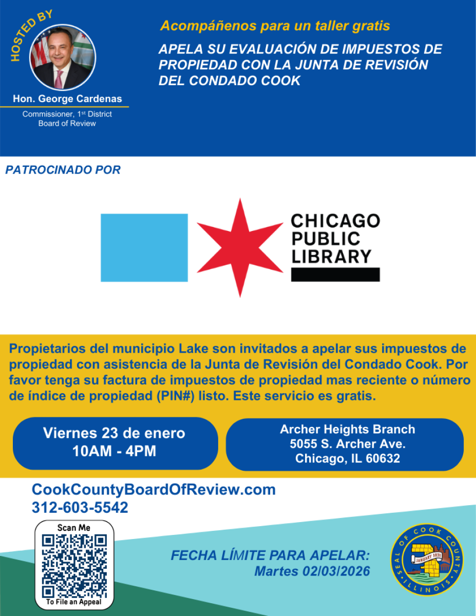 Propietarios del municipio Lake Township son invitados a llenar una apelación de impuestos de propiedad. Recibirá asistencia directa de la Junta de Revisión del Condado Cook. Por favor tenga su factura de impuestos de propiedad mas reciente o número de índice de propiedad (PIN#) listo. Ganar una apelación puede resultar en futuros impuestos de propiedad reducidos. Este servicio es gratis.