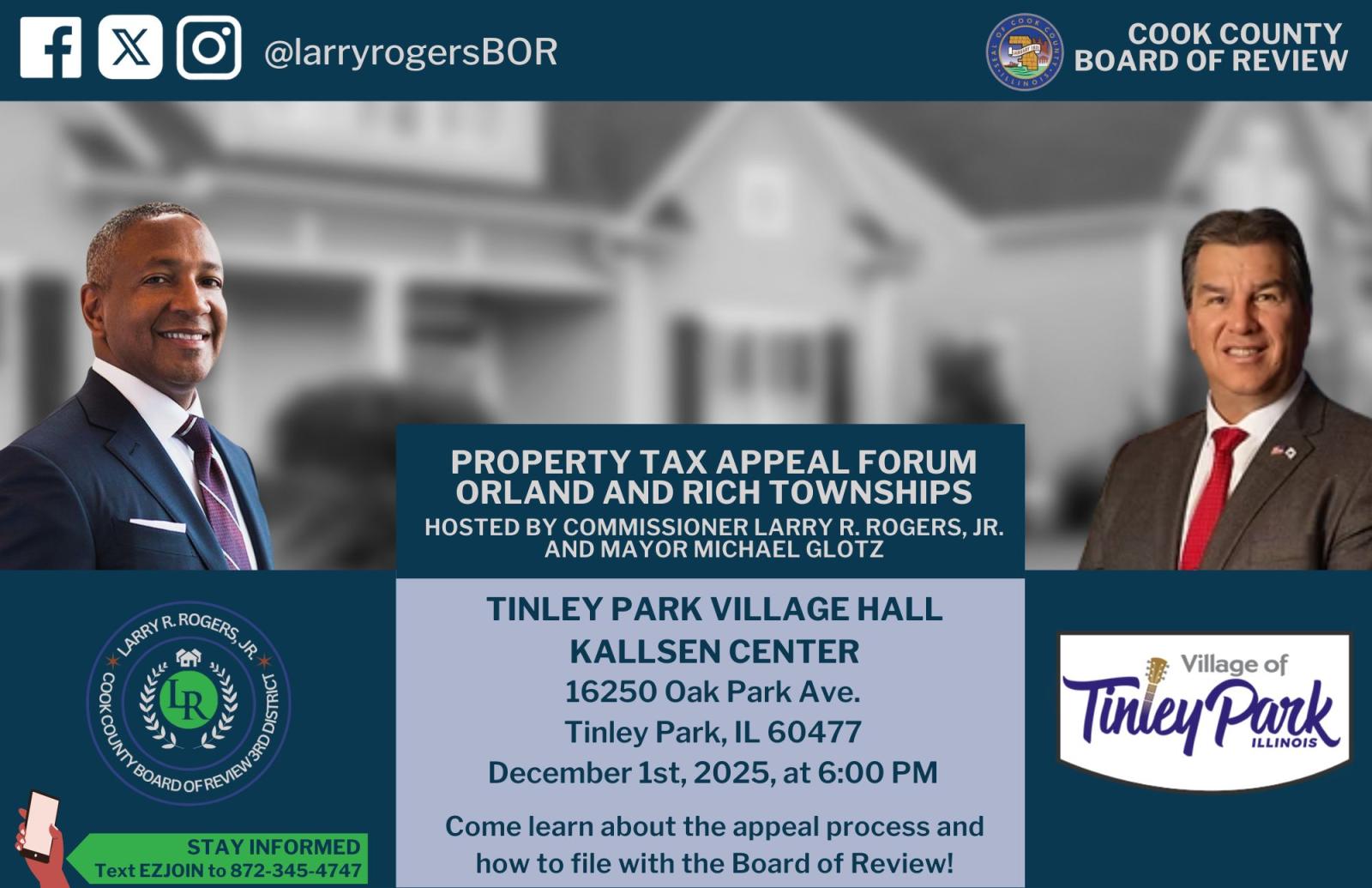 Join Commissioner Larry R. Rogers, Jr. and Mayor Michael Glotz on Monday, December 1st at 6pm for a property tax appeal forum for the taxpayers of Orland and Rich townships, explaining the property tax appeal process and how to file at the Cook County Board of Review. We look forward to seeing you and helping you navigate the process!