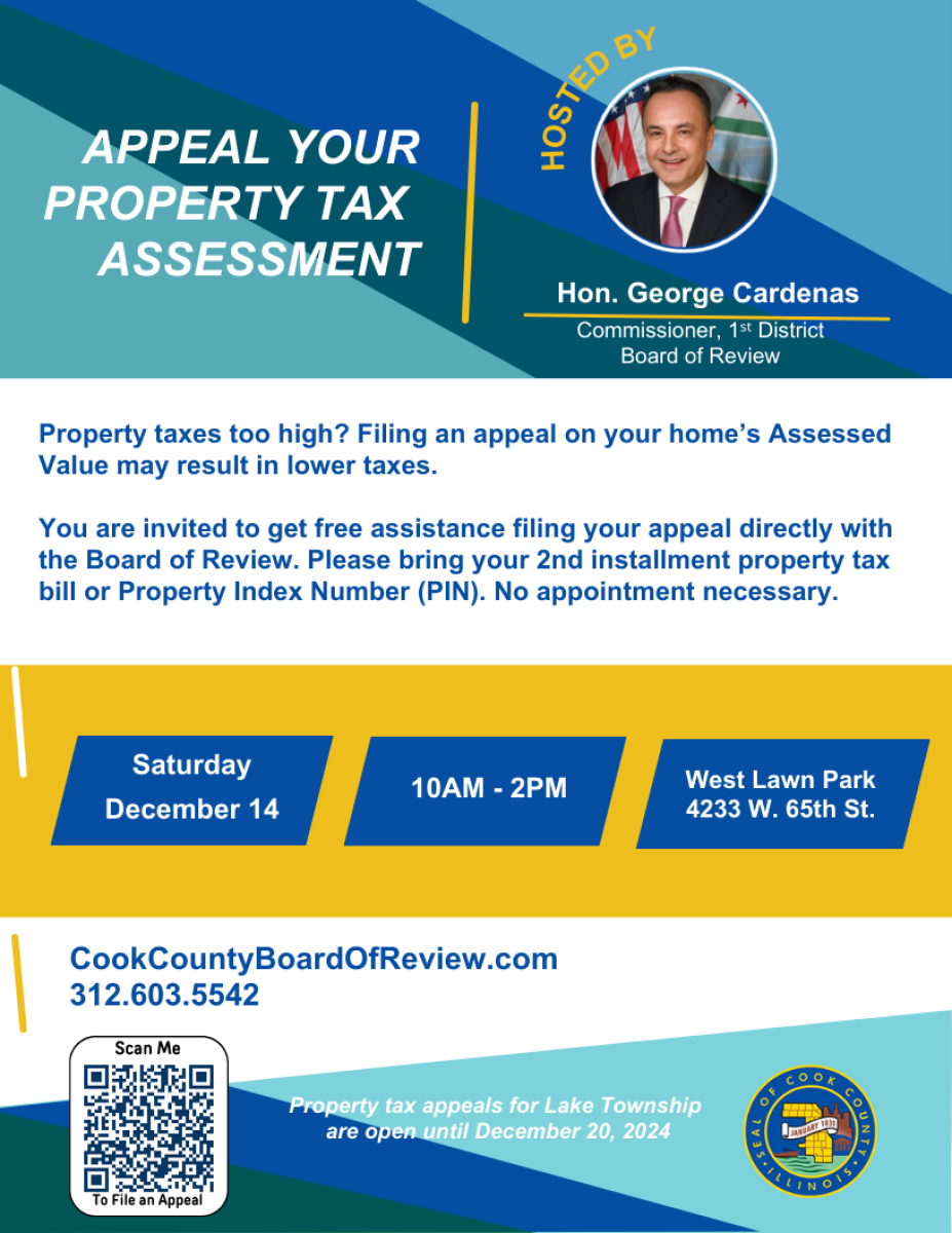 Please join the office of Cook County Board of Review Commissioner George Cardenas for a property tax appeal office hours on Saturday, December 14th from 10:00AM - 2:00PM at West Lawn Park. Analysts will be available to guide you through the appeal process and address your questions about the Cook County property tax system. Please have Your 2023 Tax Year 2nd Installment Property Tax Bill Or Property Index Number (PIN) At Hand.