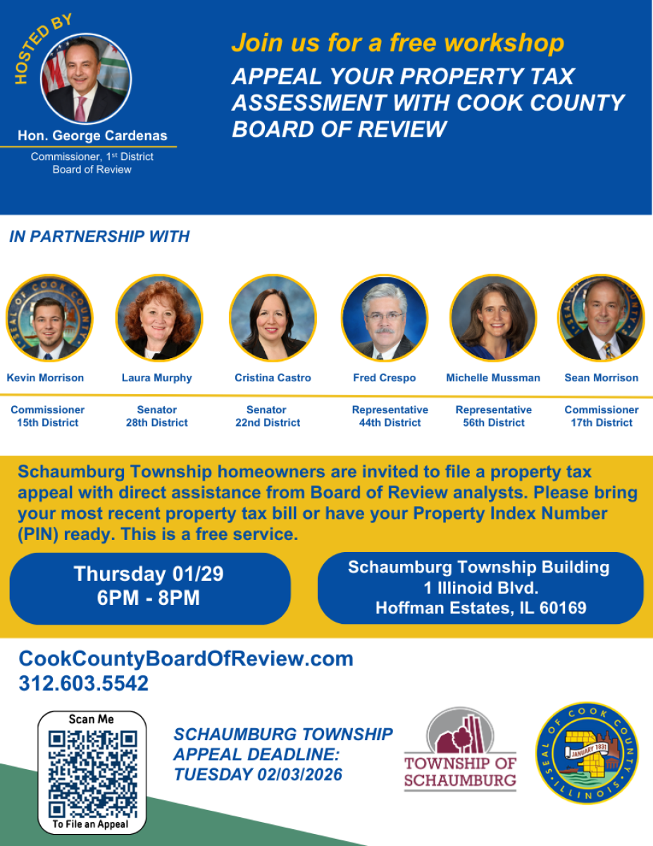 The deadline for Schaumburg Township homeowners to submit an appeal to the Board of Review is Tuesday 02/03/2026