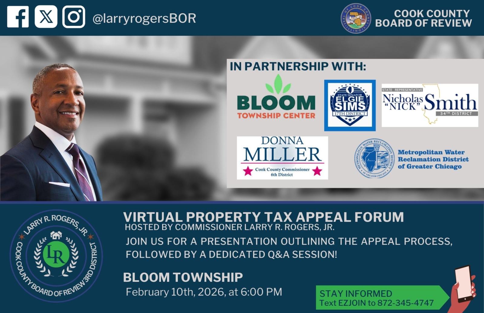 Join Commissioner Larry R. Rogers, Jr. for a virtual property tax appeal forum for the taxpayers of Bloom township, explaining the property tax appeal process and how to file at the Cook County Board of Review. There will be a 20 minute PowerPoint presentation followed by a Q and A session.